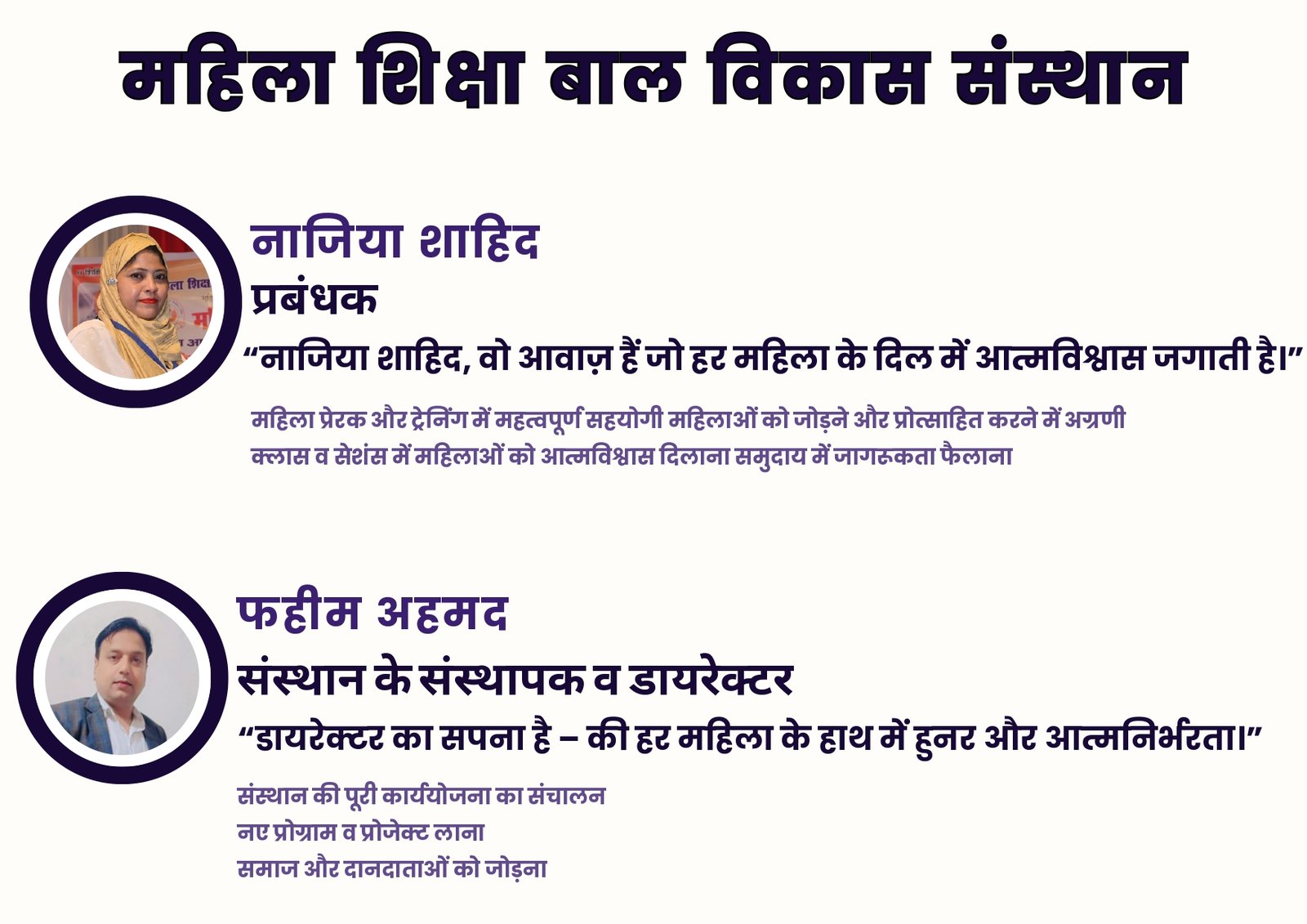 संस्थान के संस्थापक एवं निदेशक श्री फहीम अहमद और प्रबंधक श्रीमती नाजिया शाहिद का सपना है कि हर महिला के हाथ में हुनर हो, हर महिला आत्मनिर्भर बने और समाज में सम्मान के साथ आगे बढ़े।