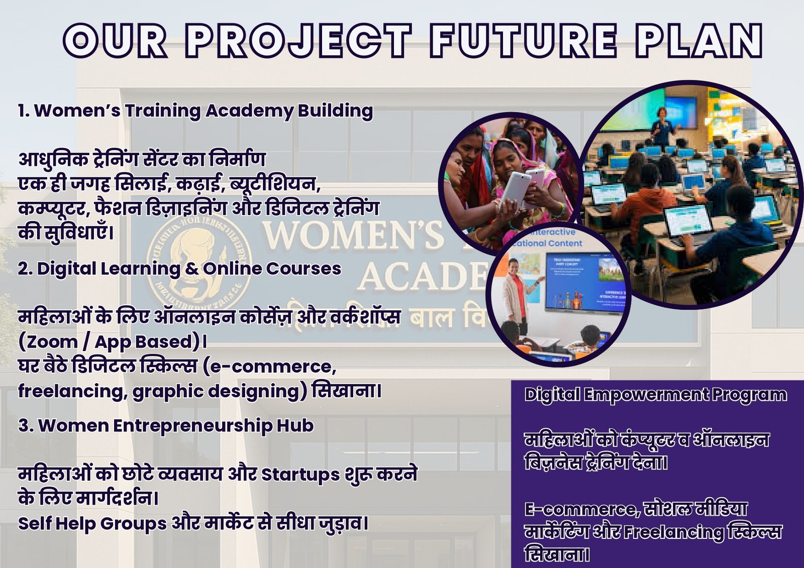 प्रत्येक ग्राम सभा में सिलाई प्रशिक्षण केंद्र खोलना ताकि हर महिला को रोजगार से जोड़ा जा सके।